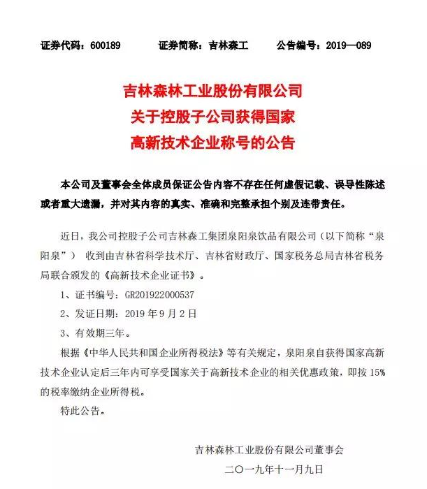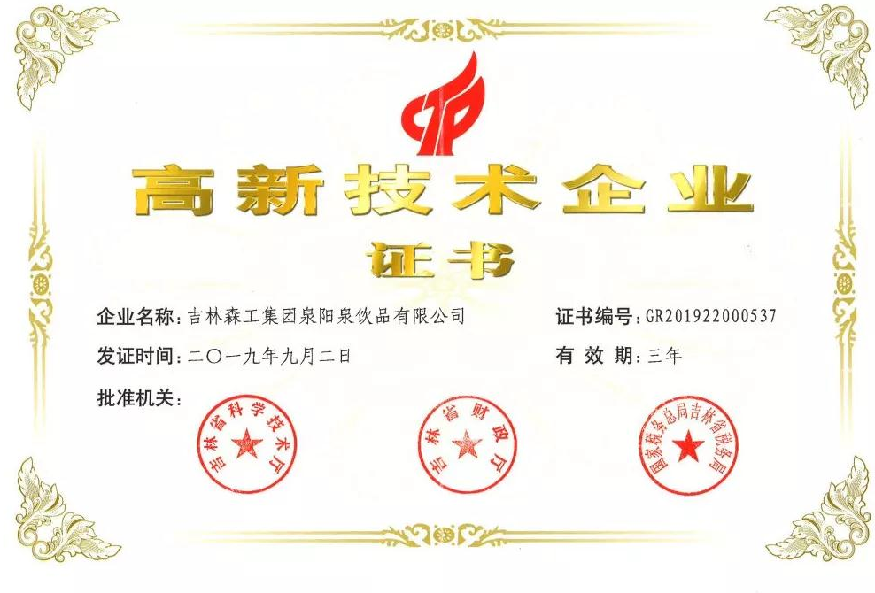 ? ? ? 根據(jù)科學(xué)技術(shù)廳、吉林省財政廳、國家稅務(wù)總局聯(lián)合頒布的《關(guān)于公布吉林省2019年第一批國家高新技術(shù)企業(yè)認定結(jié)果的通知》,經(jīng)過層層審核,吉林森工集團泉陽泉飲品有限公司由吉林省科學(xué)技術(shù)廳、吉林省財政廳、北京市國家稅務(wù)局、國家稅務(wù)總局吉林省稅務(wù)局局聯(lián)合批準下發(fā)的高新技術(shù)企業(yè)認定。