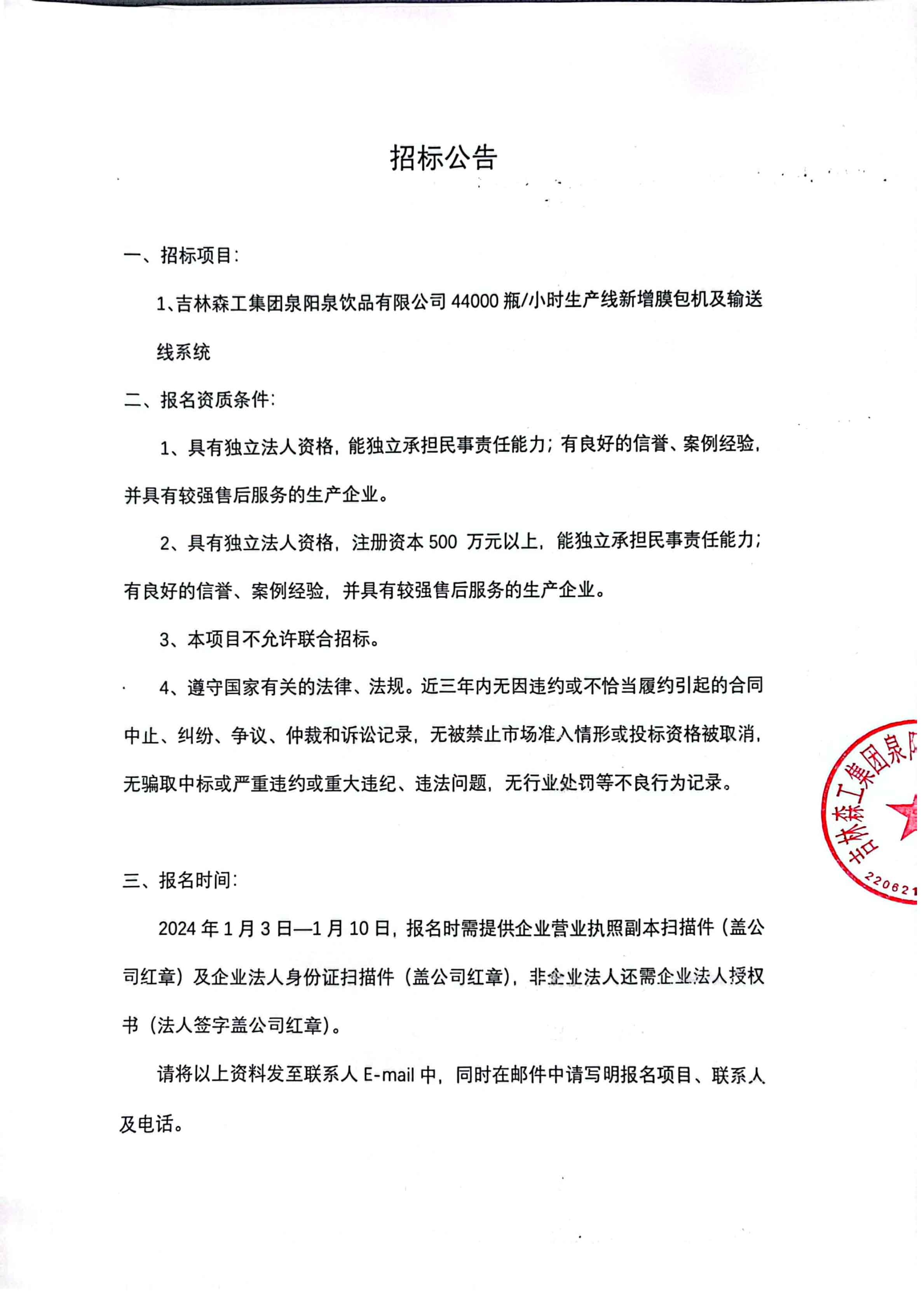 44000生產(chǎn)線新增膜包機招標公告